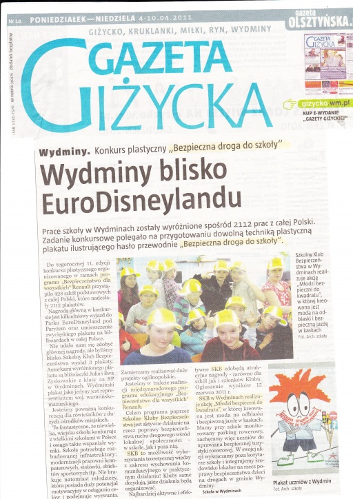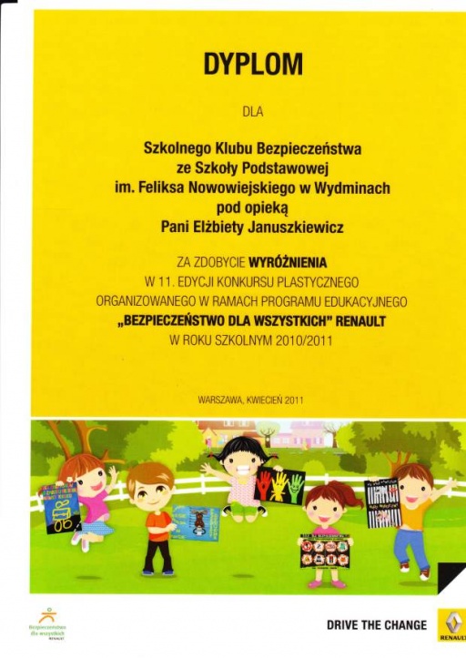 Plakat Szkolnego Klubu Bezpieczeństwa ZSO Wydminy został wyróżnionyw Ogólnopolskim Konkursie "Bezpieczna droga do szkoły". Była to 11. edycja konkursu plastycznego organizowanego w ramach programu "Bezpieczeństwo dla wszystkich" Renault.